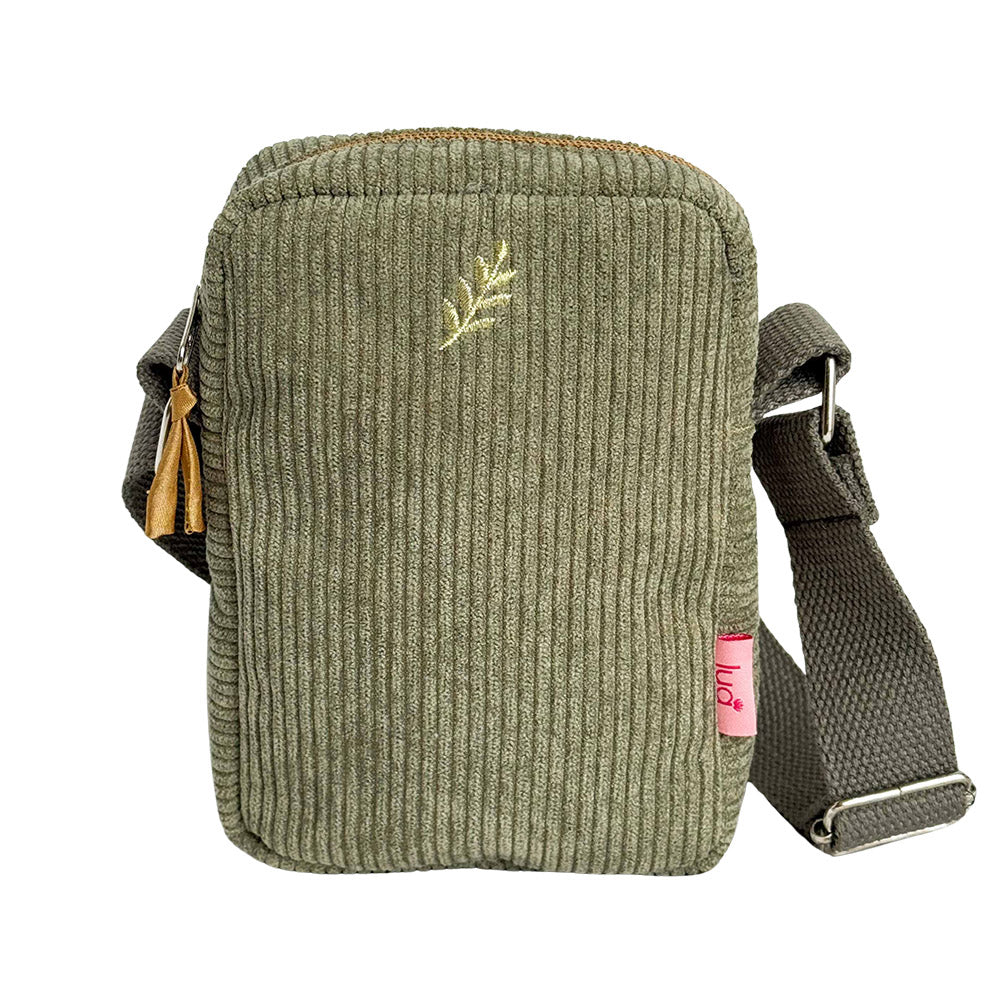 A new pouch cross body bag in velvety jumbo corduroy. Featuring silky lining, contrast statement zip colours and a hand-embroidered gold/silver little sprig on the front.