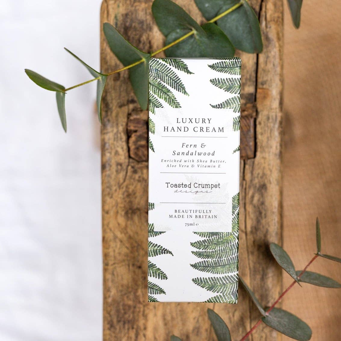 Indulge in the captivating scent of fern and sandalwood with Toasted Crumpet's Luxury Hand Cream. This 75ml cream is a charming addition to your daily beauty regimen, inspired by the beauty of the British countryside. It captures the essence of outdoor freshness, transforming it into a nurturing, moisturizing experience for your hands. Toasted Crumpet is proud to bring the glory of nature indoors with this luxurious hand cream, exclusively produced in Britain. Enjoy the unique blend of contemporary design and timeless fragrance with every application.