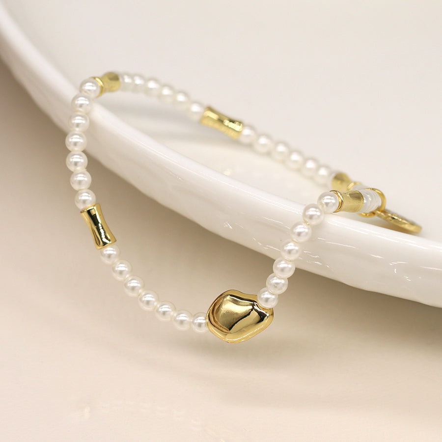Ivory seed pearl stretch bracelet with faux gold plated beads and smooth pebble
