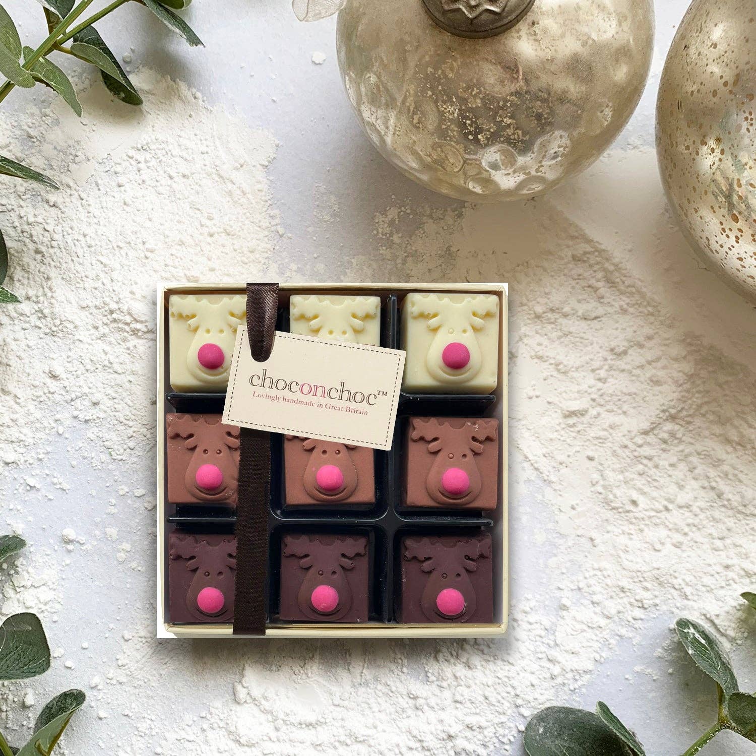 This joyful box of nine little Rudolph reindeer squares are handmade by our chocolatiers using the finest Belgian milk, white and dark chocolate. With their festive red noses, they make a wonderful treat to find in the bottom of a stocking on Christmas Day or an ideal present to gift a loved one this Christmas.
