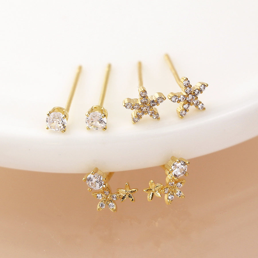 Faux gold plated triple stud earring set with classic crystal studs, crystal star flower studs and pretty multi flower crystal studs
