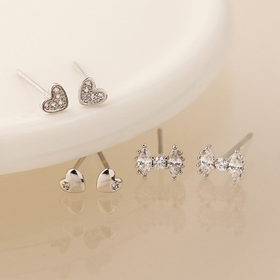 Silver plated triple stud earring set with 2 pairs of crystal detailed heart studs and a pair of sparkle bows