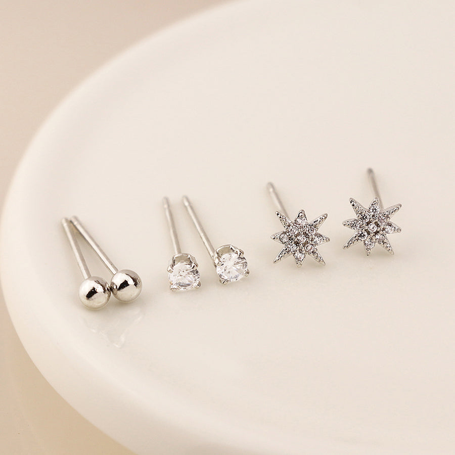 Silver plated triple stud earring set with simple round bead, classic crystal and sparkle star earrings