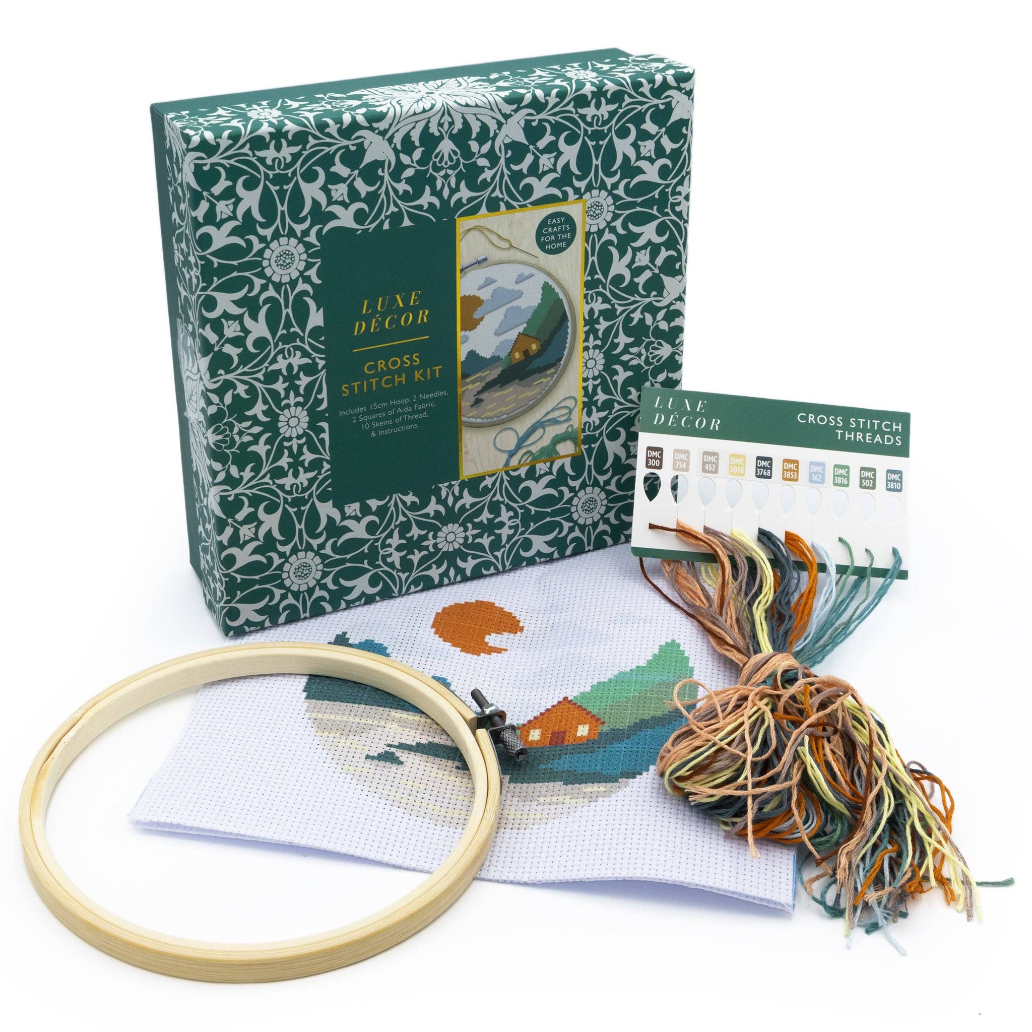 KIT INCLUDES EVERYTHING YOU NEED: The box contains 10 skeins of coloured threads, 2 needles, 2 squares of aida fabric, a 15cm wooden embroidery hoop and full step-by-step instructions.