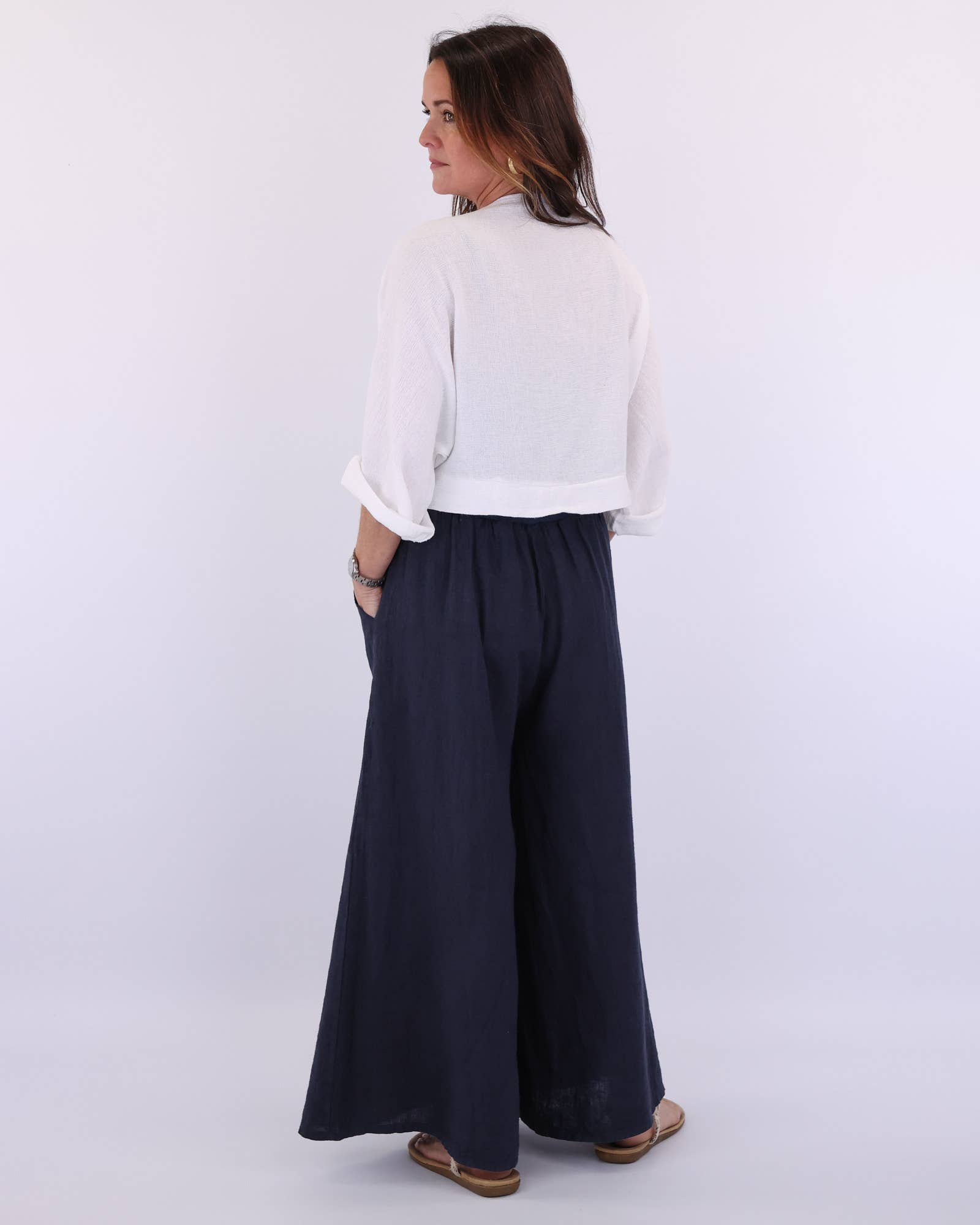 The perfect waist length to wear with our linen trousers, or over a dress, simply tie at the front. Cool and comfortable in our soft linen/cotton blend fabric, with a pretty decorative inset edging at the front, and three quarter length sleeve which can be rolled up to suit!