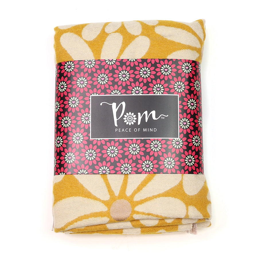 Soft mustard yellow and ecru jacquard scarf with retro daisy pattern and eyelash fringe