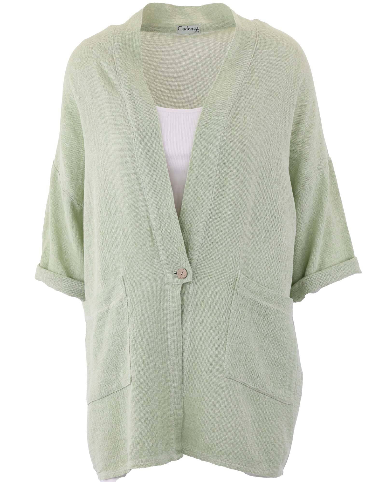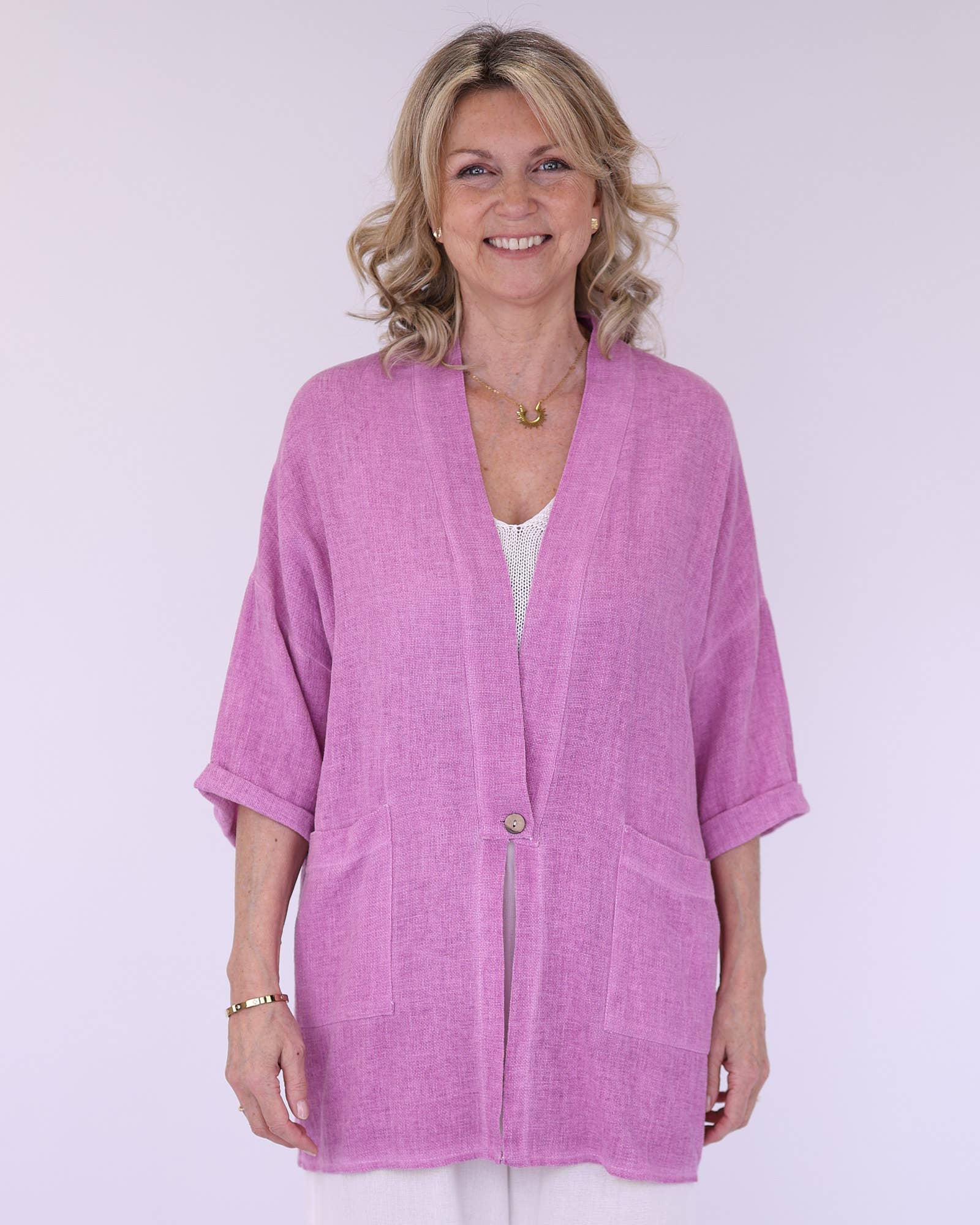A relaxed fit kimono style jacket with a single coconut button fastening and front pockets: great when you want to achieve that loose, layered look with our linen trousers. Three quarter length sleeves can be rolled up or down.
